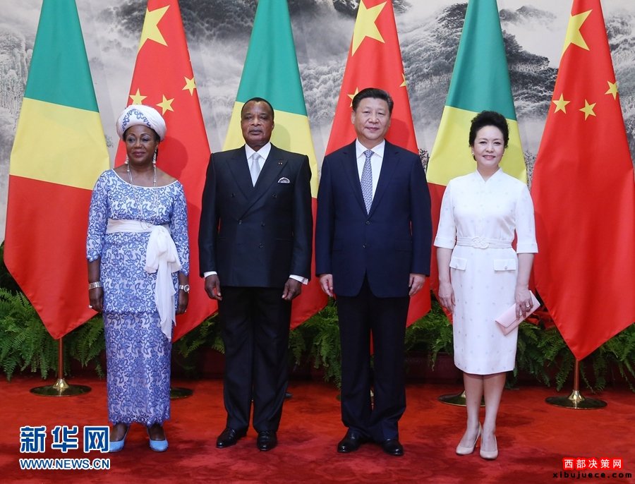7月5日,國家主席習近平在北京人民大會堂同剛果共和國總統薩蘇舉行會談。會談前,習近平在人民大會堂東門外廣場為薩蘇舉行歡迎儀式。這是習近平和夫人彭麗媛同薩蘇總統夫婦合影。新華社記者姚大偉攝