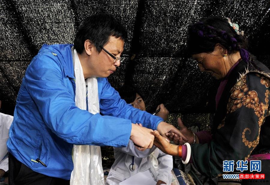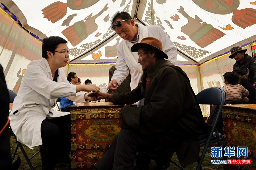 7月17日,北京大學(xué)人民醫(yī)院主治醫(yī)師劉田(左)在西藏人民醫(yī)院醫(yī)務(wù)處次仁達娃的翻譯下為巴爾卡村一名牧民查體。當(dāng)日,來自北京協(xié)和醫(yī)院、北京大學(xué)人民醫(yī)院、北京大學(xué)第三醫(yī)院等醫(yī)院的12名援藏醫(yī)療專家深入偏遠(yuǎn)的墨竹工卡縣門巴鄉(xiāng)巴爾卡村,為農(nóng)牧民義診。新華社記者 張汝鋒 攝