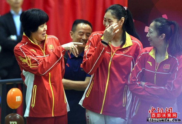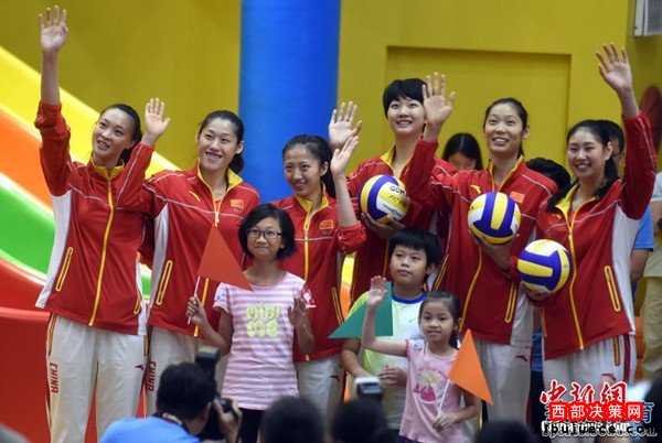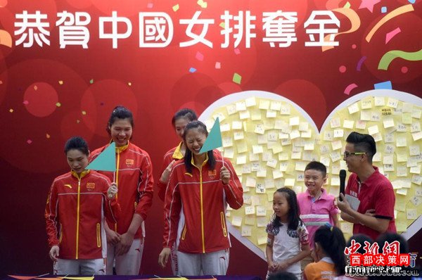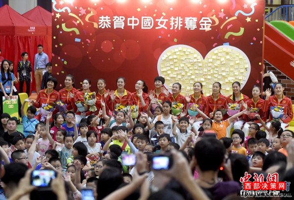 北京時(shí)間8月28日,女排隊(duì)員在香港與市民見(jiàn)面。見(jiàn)面會(huì)上女排姑娘與當(dāng)?shù)貎和M(jìn)行了互動(dòng)游戲,女排主教練郎平幽默扮鬼臉令人捧腹大笑。