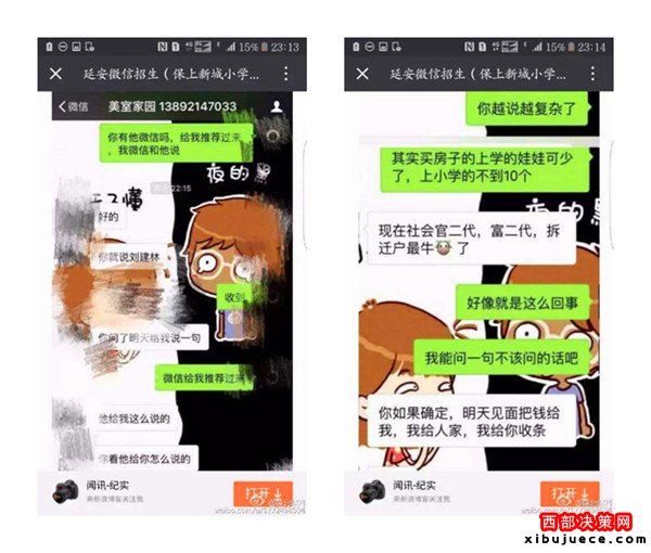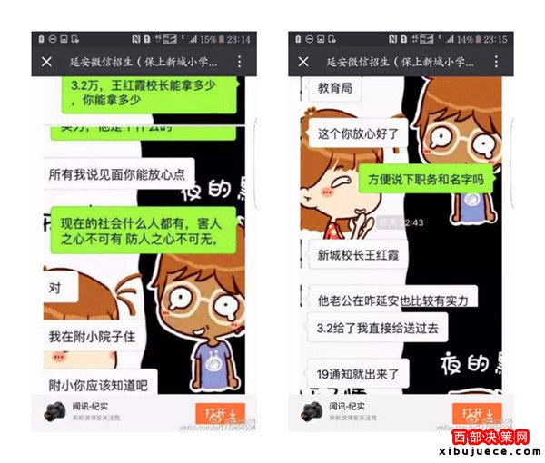 近日,一則題為《延安微信招生(3.2萬(wàn)保上新城小學(xué))請(qǐng)相關(guān)部門給予調(diào)查公布真相》的帖子在朋友圈瘋傳,內(nèi)容是一位微信名叫“延安微信招生(保上新城小學(xué))”的微友,聲稱只要花3.2萬(wàn)元,保證可以在新區(qū)小學(xué)入學(xué),并解釋有中間人,錢并不是直接給校長(zhǎng)王紅霞,但愿意提供自己的車號(hào)、身份證號(hào)、家庭住址等信息作為擔(dān)保。3.2萬(wàn)真的能夠保上延安新區(qū)小學(xué)嗎?事情真相究竟如何,記者展開(kāi)調(diào)查。
