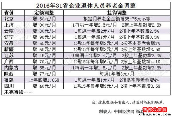 據(jù)統(tǒng)計(jì),已公布方案的省份多采用定額調(diào)整、掛鉤調(diào)整與適當(dāng)傾斜相結(jié)合的調(diào)整辦法。對(duì)于企業(yè)退休人員來(lái)講,單就定額調(diào)整,遼寧省每人每月調(diào)整金額相對(duì)最高,增加90元,云南省定額調(diào)整數(shù)額相對(duì)較少,增加30元每月。
