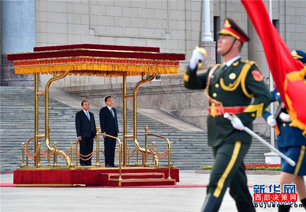 會(huì)談前,李克強(qiáng)在人民大會(huì)堂東門外廣場(chǎng)為阮春福舉行歡迎儀式。