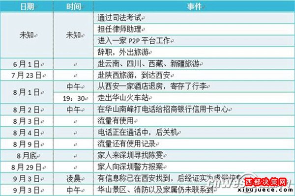據(jù)陳雯表姐蔡女士介紹,陳雯于2016年6月1日起,自深圳前往云南、西藏、新疆等地游玩,7月22日自烏魯木齊飛往咸陽(yáng),隨后與家人失去聯(lián)絡(luò),且微信好友均被拉黑,自8月2日起,手機(jī)便處于關(guān)機(jī)狀態(tài)。