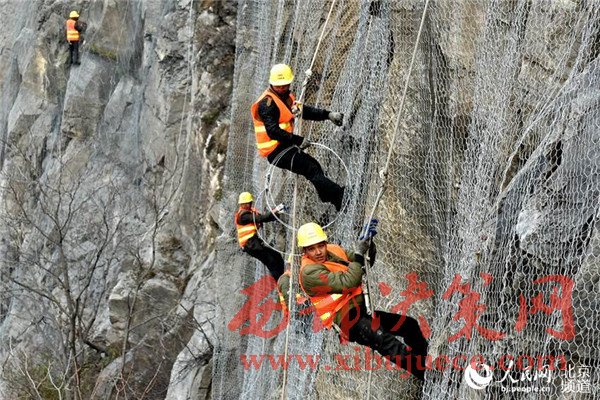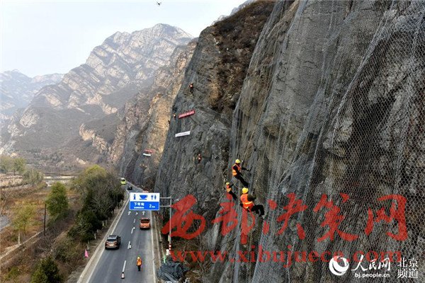 北京大山里的蜘蛛人網(wǎng)住懸崖保行車安全