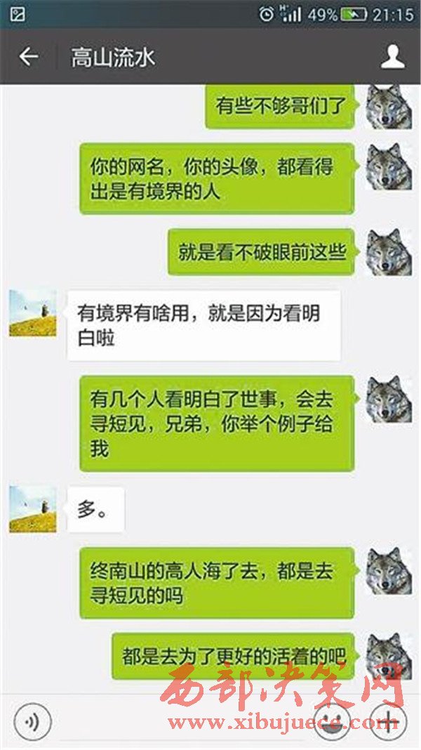 “跳樓算啦”、“堅(jiān)持不了了,死了也好”……11月12日晚,身在陜西的王先生怎么也睡不著,微信里23歲邛崍小伙徐超(化名),不斷表達(dá)著自己的“死意已決”。這讓他變得緊張而擔(dān)心,他不停地通過(guò)微信發(fā)去勸說(shuō)信息,同時(shí)兩次向四川警方報(bào)警,希望小伙能夠放棄輕生的念頭。而其實(shí)兩人并不相識(shí),“只是通過(guò)一個(gè)帖子偶然結(jié)識(shí)的,甚至不知道他的名字。”王先生說(shuō)。