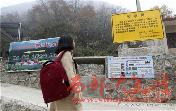 昨日上午,華商報記者來到王莽街道小峪河村涉事農(nóng)家樂,該農(nóng)家樂仍在正常營業(yè)。在農(nóng)家樂門口,立著一個很顯眼的黃色警示牌,是長安區(qū)防汛抗旱指揮部辦公室設(shè)置的,上面寫著2015年8月3日突發(fā)山洪造成九人死亡的事情,并提醒群眾遠離河道,雨天不得在溝口逗留,不得在此亂搭亂建,該牌子。在警示牌下面,有一條用水泥砌成的水溝,從路邊一直通往山上,華商報記者注意到,在山坡上有水向下流出。