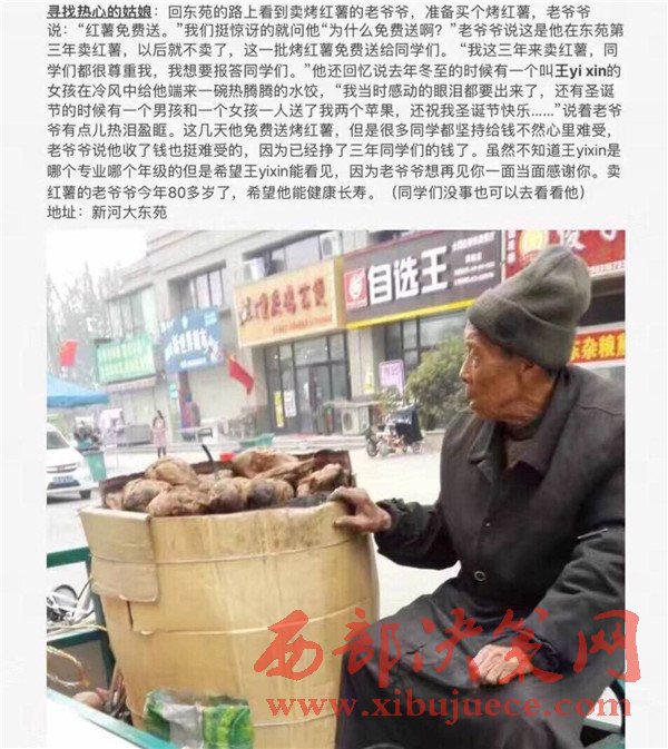 說起這位賣紅薯的老爺爺,河南大學的學生們印象都十分深刻,紛紛道出了自己和賣紅薯老爺爺之間的暖心事。