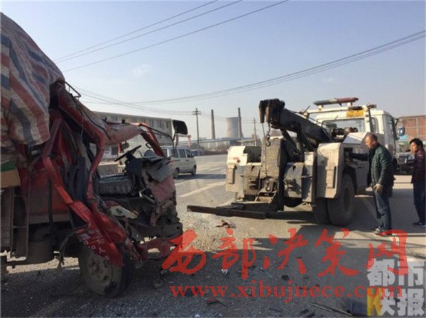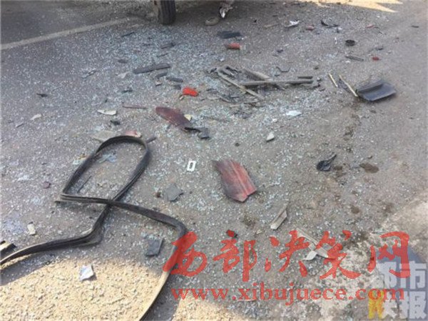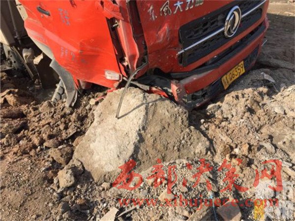 記者在事發(fā)地108國(guó)道西安市戶(hù)縣境內(nèi)看到,被撞的小貨車(chē)已經(jīng)面部全非,前部完全破損。而在這邊一輛拉沙車(chē)已經(jīng)沖到了路基下,發(fā)生傾斜。