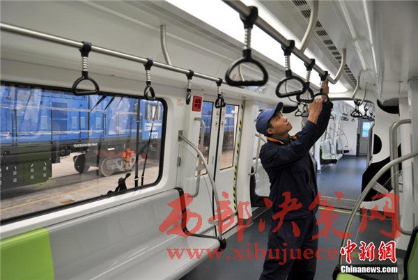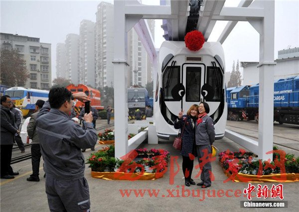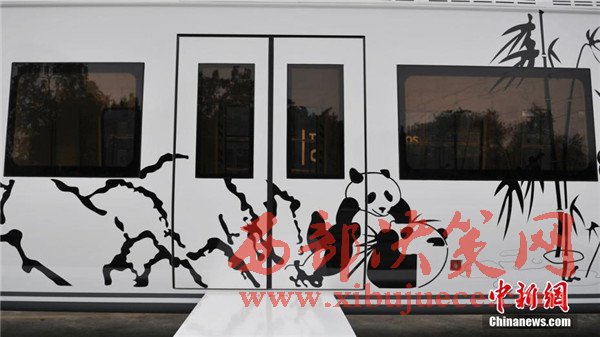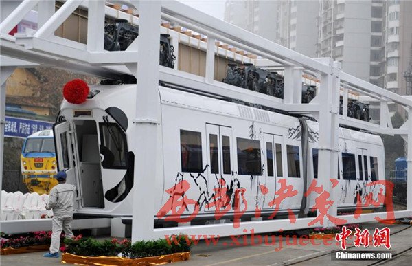 記者在現(xiàn)場看到,正式下線的空鐵車身為卡通熊貓山水圖案,酷似“熊貓”,每列定員144人,時速最高可達(dá)65公里。列車采用“大容量動力蓄電池充放電控制技術(shù)”,通過實(shí)現(xiàn)高倍率放電,提高列車起動加速性能及對極限環(huán)境的適應(yīng)性,同時能將400千瓦的電制動功率全部用于動力電池快速充電,實(shí)現(xiàn)制動能量回收再利用,延長蓄電池續(xù)航里程達(dá)120千米。圖為車身外繪制有熊貓山水圖案。