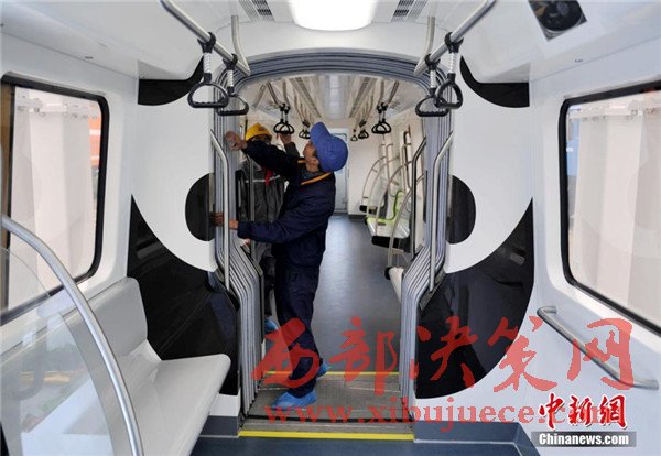 此外,列車整體結(jié)構(gòu)也采用輕量化設(shè)計,全線無人駕駛,能像地鐵、動車組一樣靈活編組。列車在懸掛裝置設(shè)有兩級保護(hù),還在駕駛室內(nèi)設(shè)有緊急逃生筒和故障救援門,可實(shí)現(xiàn)縱向、橫向及垂向的三維救援,確保了突發(fā)情況下乘客的安全。圖為車廂內(nèi)也繪有“熊貓”圖案。