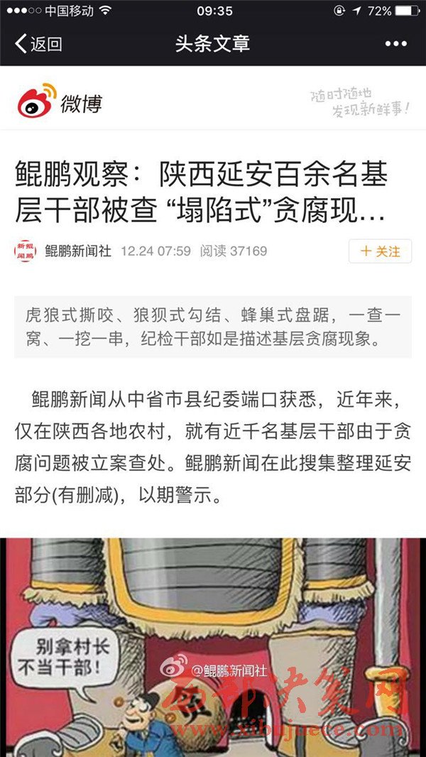 據(jù)微博 鯤鵬新聞社爆料 從中省市縣紀委端口獲悉,近年來,僅在陜西各地農(nóng)村,就有近千名基層干部由于貪腐問題被立案查處。鯤鵬新聞在此搜集整理延安部分(有刪減),以期警示。
