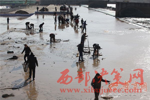 12月27日上午,咸陽湖放水剛結(jié)束,渭城橋下瞬間就變成了漁場,數(shù)百人在橡膠壩附近撿魚捕魚,有人甚至不顧危險(xiǎn)跑到淤泥里去撈魚。咸陽湖管理處工作人員提醒,湖底淤泥情況不明,市民切勿涉險(xiǎn)下湖撈魚,以免發(fā)生不測。