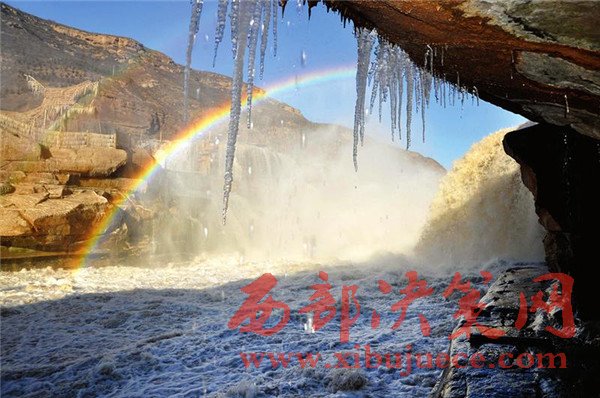 近日,受降溫天氣影響,位于山西吉縣和陜西宜川縣交界的黃河壺口瀑布出現(xiàn)冰掛彩虹景觀。
