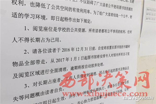 圖書館工作人員說,這是接到學校辦公室統(tǒng)一通知的,今天早上九點就將閱覽座位上的所有東西全部清理到了一樓大廳,同學們如果有意見可以明天上班后去找學校辦公室反映。