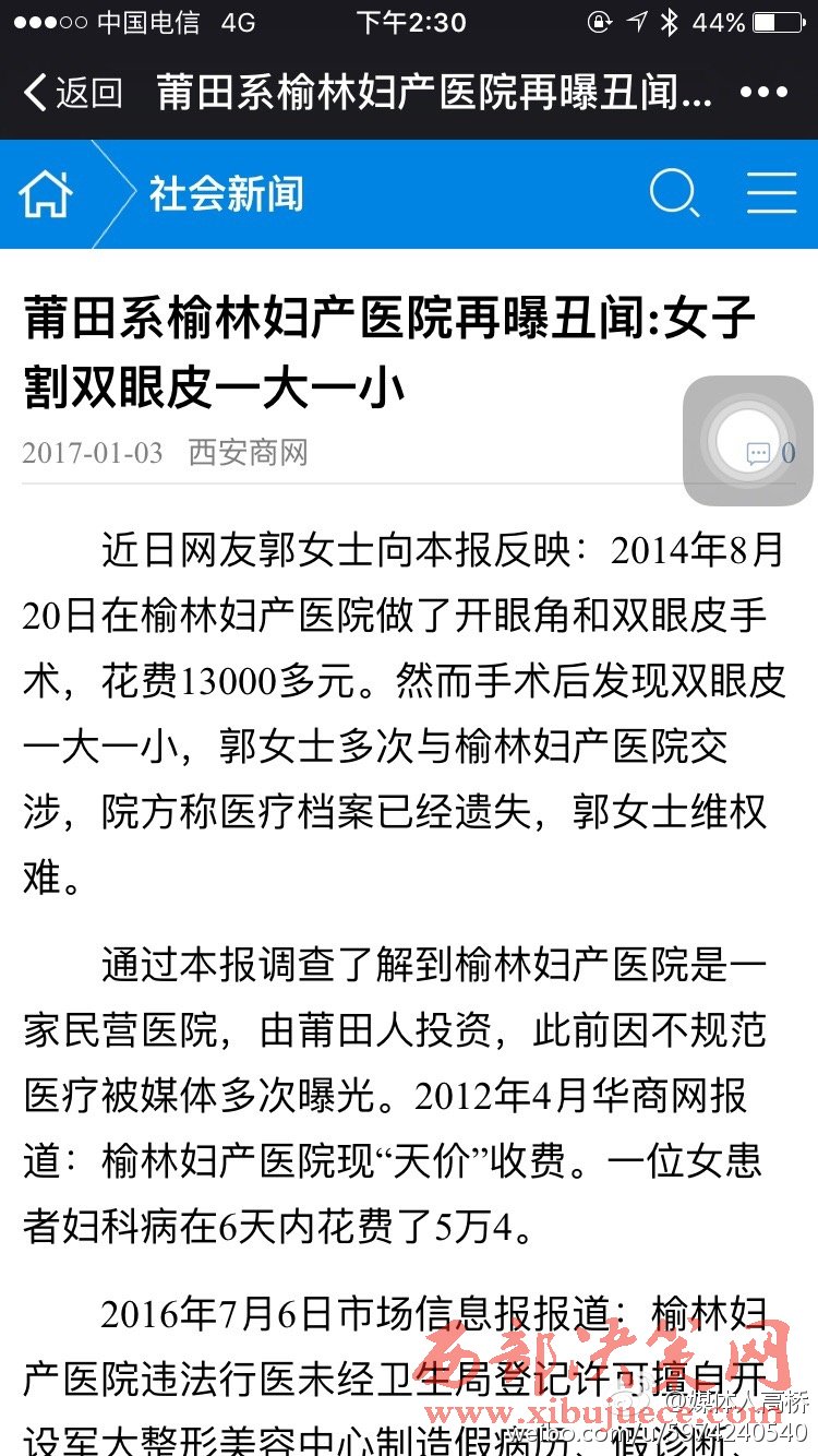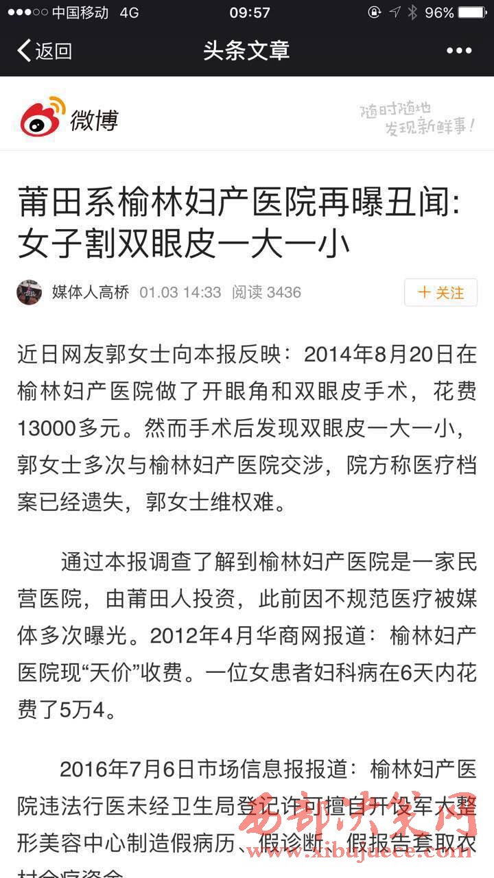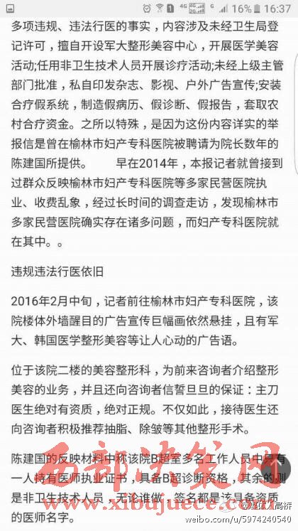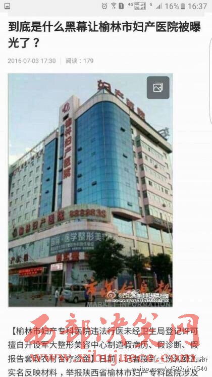 2016年7月6日市場(chǎng)信息報(bào)報(bào)道:榆林婦產(chǎn)醫(yī)院違法行醫(yī)未經(jīng)衛(wèi)生局登記許可擅自開設(shè)軍大整形美容中心制造假病歷、假診斷、假報(bào)告套取農(nóng)村合療資金。