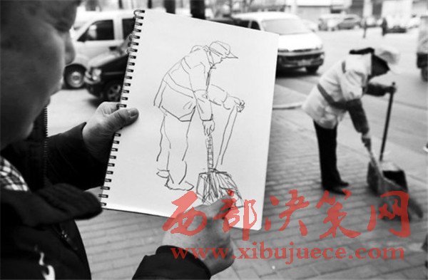 昨天下午,記者見到李福昌,他拿起素描本和記者一起出了門,家門口永新路上,一名保潔員打開道沿邊的垃圾桶,拎出內(nèi)膽,將垃圾倒進(jìn)清運(yùn)車。李福昌靜靜站在10米開外的地方,打開本子拿起筆,寥寥幾筆就將一位正在掃地的保潔員生動(dòng)形象地勾勒出來。他沒有上前打擾保潔員,保潔員也沒有發(fā)現(xiàn)他。隨后,他又來到大興路、西二環(huán),保潔員忙碌的身影都被他一一收入畫中。