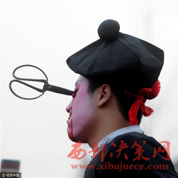 刀具化妝非常神速,一個(gè)人的化妝也就三五分鐘,很快就從棚子中走出進(jìn)入表演現(xiàn)場(chǎng)。一名血社火傳承人介紹:“血社火的秘密就在化妝,而且我們歷來傳男不傳女,更不能隨便向外人透露”。