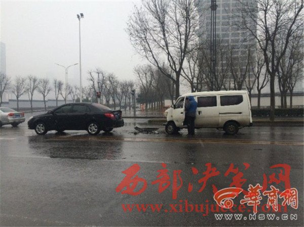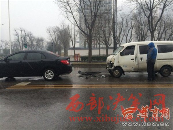 西安降雪,緩解了霧霾天氣,不過(guò)雪天路滑,給司機(jī)行車帶來(lái)不少麻煩。昨日下午2時(shí)50分許,在西安市雁翔路一處丁字路口,一輛白色面包車因紅燈剎車不及,撞上了前面停車等紅燈的一輛黑色私家車,造成車頭損毀,所幸兩車司機(jī)均未受傷。提醒司機(jī)朋友,雨雪天氣路面濕滑,請(qǐng)謹(jǐn)慎行駛,注意保持安全車距,以免發(fā)生意外。