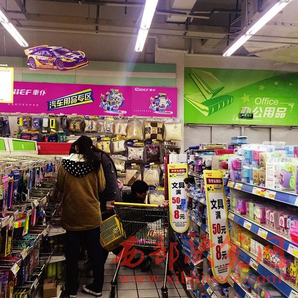 昨日記者在和平門(mén)外一超市二樓看到,入口處擺滿(mǎn)了本子、文具盒、書(shū)包等學(xué)習(xí)用具,“開(kāi)學(xué)樂(lè)淘淘”的宣傳海報(bào)有“買(mǎi)50元,減8元”的優(yōu)惠活動(dòng)。