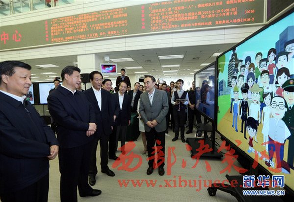 2016年2月19日,中共中央總書記、國家主席、中央軍委主席習(xí)近平在北京主持召開黨的新聞輿論工作座談會(huì),并到中央新聞單位調(diào)研。這是習(xí)近平在新華社觀看新聞信息產(chǎn)品展示。新華社記者蘭紅光攝