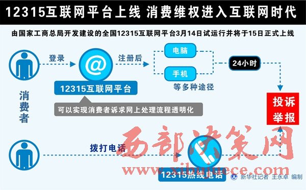 由國家工商總局開發(fā)建設的全國12315互聯(lián)網平臺14日試運行并將于15日正式上線,消費者在平臺上登錄注冊后可以通過電腦、手機等多種途徑24小時進行投訴、舉報。