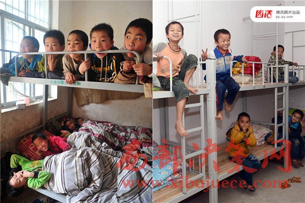 近些年,政府和民間組織相繼推進兩免一補、免費午餐工程等,加大投入改善農(nóng)村基礎教育環(huán)境。左圖:2014年3月28日,廣西廣西都安瑤族自治縣梅珠小學學生宿舍,一個床上擠著3、4名學生;右圖:廣西啟動為期4年的全面改善貧困義務教育薄弱學?;巨k學條件計劃,率先攻堅“大通鋪”難題,梅珠小學的孩子們告別三四人的“大通鋪”,實現(xiàn)一人一床。