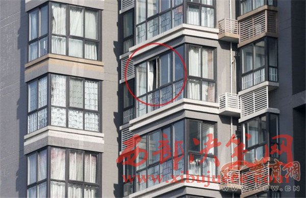 2016年12月8日,西安市朱雀大街南段一小區(qū),D1樓26層一住戶家的陽臺窗戶掉落,圖中畫圈處為掉落的窗戶。把正在樓下倒垃圾的一位住戶砸傷。
