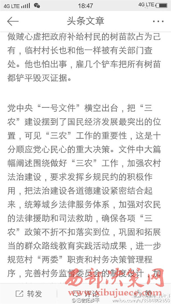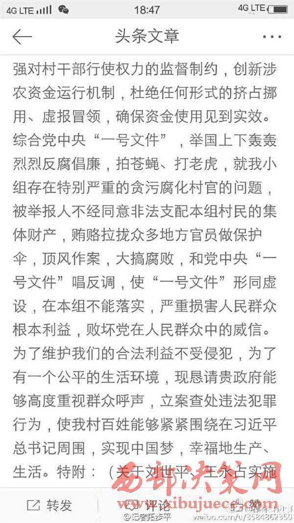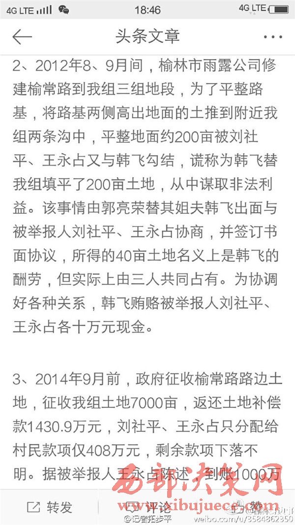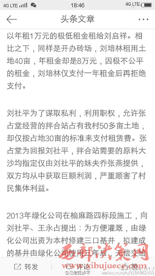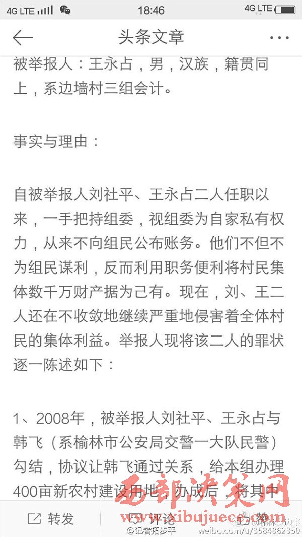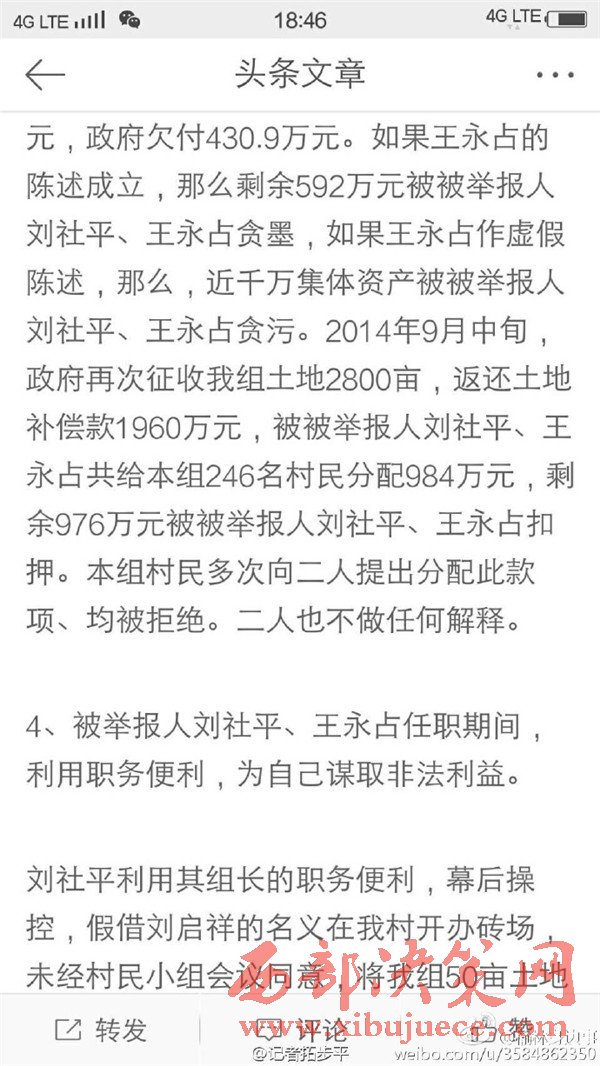 近日有微博網(wǎng)友飆新聞微博爆料:自被舉報(bào)人劉社平、王永占二人任職以來,一手把持組委,視組委為自家私有權(quán)力,從來不向組民公布賬務(wù)。他們不但不為組民謀利,反而利用職務(wù)便利將村民集體數(shù)千萬財(cái)產(chǎn)據(jù)為己有。請相關(guān)部門調(diào)查回復(fù)!