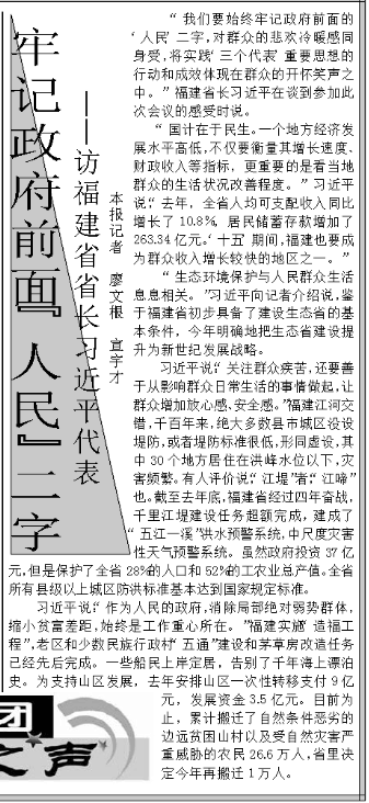 “我們要始終牢記政府前面的‘人民’二字,對(duì)群眾的悲歡冷暖感同身受。”2002年3月4日,人民日?qǐng)?bào)兩會(huì)特刊的“代表團(tuán)之聲”欄目里,刊發(fā)了對(duì)時(shí)任福建省省長的習(xí)近平代表的采訪,標(biāo)題是《牢記政府面前“人民”二字》。