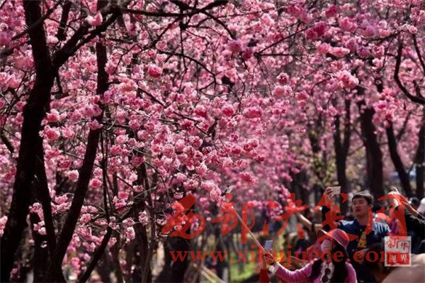 游人在昆明圓通山公園拍攝盛開(kāi)的櫻花。