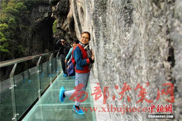 3月24日,地處廣西融安縣石門仙湖景區(qū)的玻璃棧道試運行,數十名游客體驗“嘗鮮”。該玻璃棧道建在距離谷底達60米的懸崖壁上,下方是石門仙湖山石峻峭的中天坑,全長309.4米、寬1.6米,是目前廣西最長的玻璃棧道。
