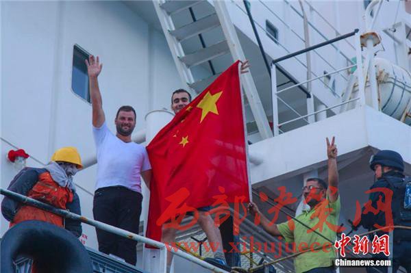 圖為船員獲救后,對(duì)中國(guó)海軍的營(yíng)救表示感謝。