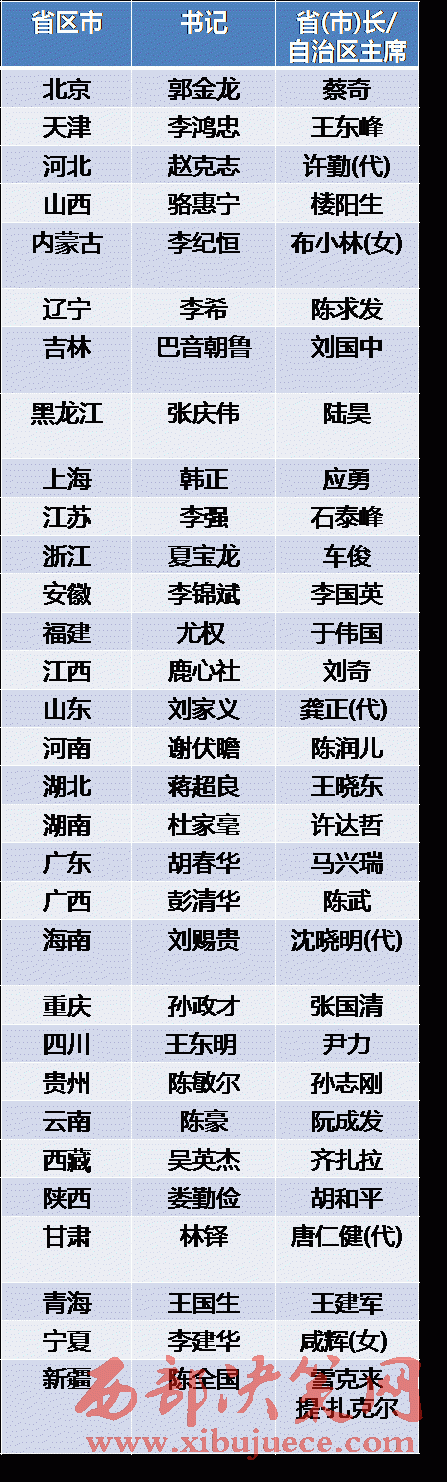 全國(guó)31省區(qū)市現(xiàn)任黨政“一把手”名單