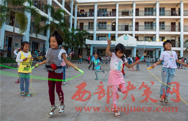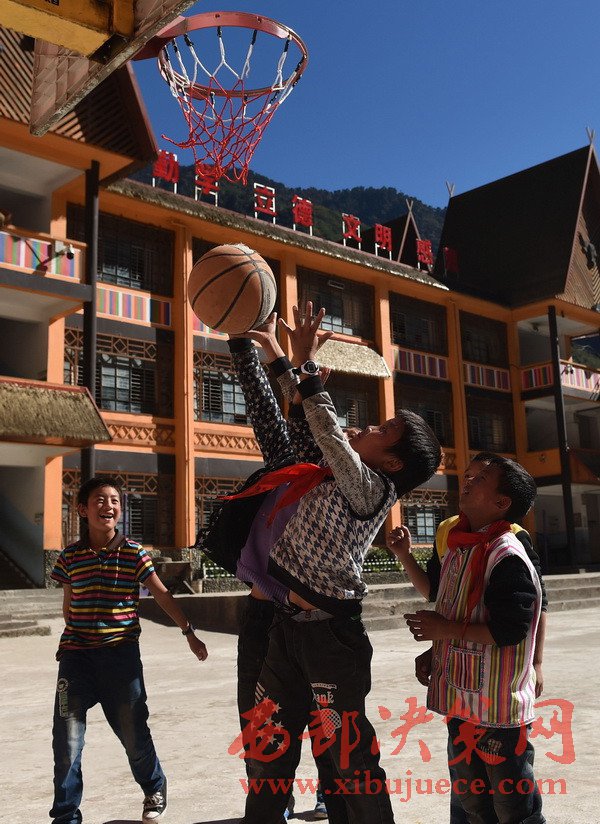 這是云南省貢山獨龍族怒族自治縣獨龍江鄉(xiāng)中心小學的獨龍族學生在新建成的教學樓前打籃球(2016年11月23日攝)。