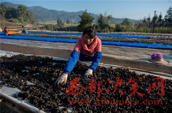 這是云南省德宏傣族景頗族自治州隴川縣隴把鎮(zhèn)龍安村的景頗族婦女張木栽在村里的木耳基地里干活(1月19日攝)。
