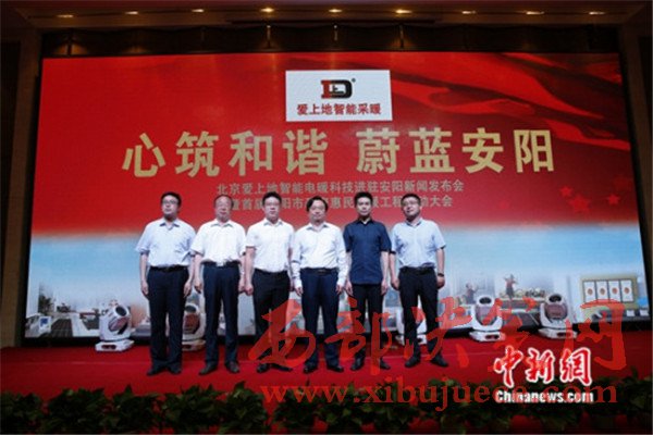 近日,北京愛上地智能電暖科技進駐安陽新聞發(fā)布會在安陽舉辦,本次發(fā)布會主題為——“心筑和諧蔚藍安陽”,旨在通過加快推進清潔取暖,讓民心更暖天更藍。安陽市人民政府副市長田海濤、安陽市殷都區(qū)委常委、常務副區(qū)長馬衛(wèi)、殷都區(qū)商務局局長李昳嫻、北京愛上地科技有限公司董事長叢建光參加了發(fā)布會。