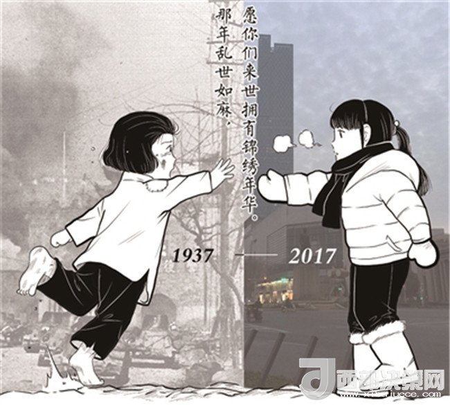 “那年亂世如麻,愿你們來世擁有錦繡年華”。昨日,這句話被許多網(wǎng)友轉(zhuǎn)發(fā)提及,這句話來自于一張漫畫圖,圖中兩名分別來自1937年和2017年的女孩隔空相對,一人身邊戰(zhàn)火紛飛,一人身處和平現(xiàn)代。這幅圖的作者朱彥告訴記者,該圖創(chuàng)作于去年12月,今年有網(wǎng)友把原圖中的2016年換成了2017年,之所以想要畫這張圖,是因為想讓大家不要忘記這段歷史,而網(wǎng)友的大量關(guān)注在他們意料之外,“說明我們想表達(dá)的情緒網(wǎng)友感受到了。”