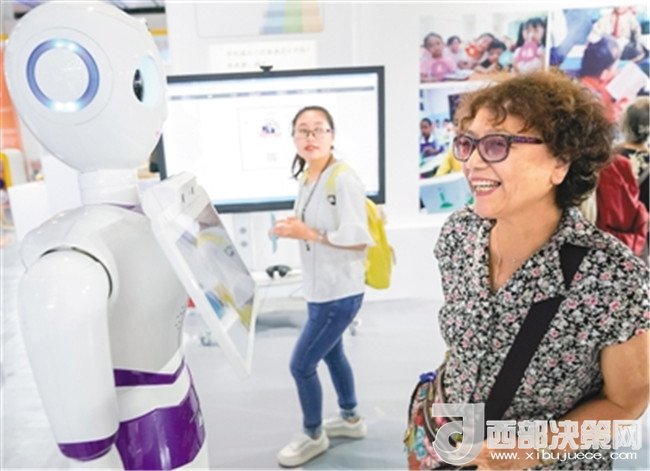 在首屆中國(guó)北京國(guó)際語(yǔ)言文化博覽會(huì)上,一名參觀者與智能客服機(jī)器人交流。 (