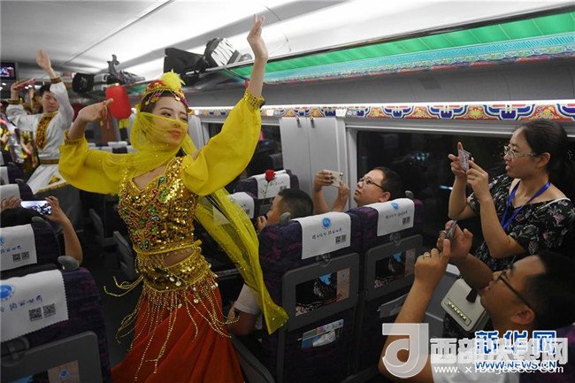 蘭州客運(yùn)段列車員在蘭州鐵路局開(kāi)行的首趟寶蘭高鐵G2028次動(dòng)車組上為旅客表演節(jié)目(7月9日攝)。7月9日,寶雞至蘭州高鐵正式開(kāi)通運(yùn)營(yíng),西北的甘肅、青海、新疆由此融入全國(guó)高鐵大家庭。