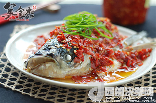 3.魚頭鋪上適量的剁椒,不愛吃辣的可以少放些。