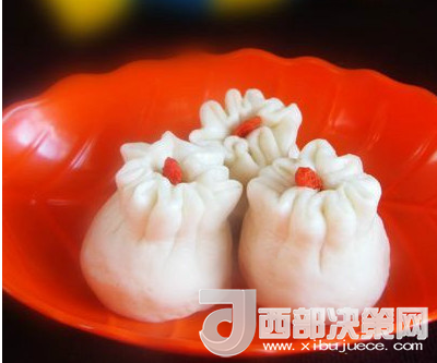 5、將圓片四周捏在一起做成生坯;在生坯上點(diǎn)綴枸杞,醒20分鐘,蒸15分鐘即可。