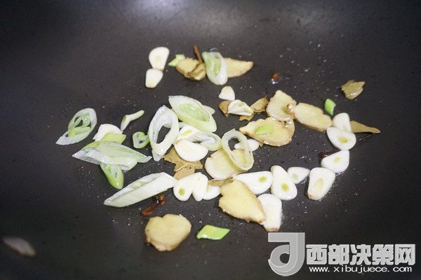 3、炒鍋放入適量油,燒熱后放入蔥段姜片蒜瓣,加入香葉和丁香,翻炒爆香。