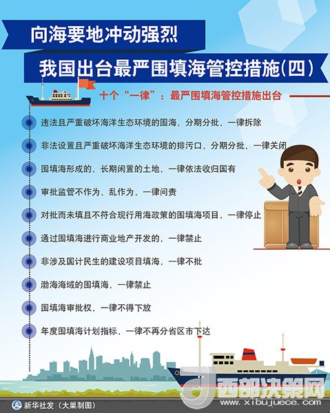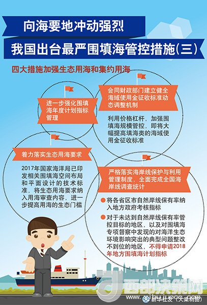 ?。保啡眨瑖?guó)家海洋局舉行圍填海情況新聞發(fā)布會(huì),國(guó)家海洋局副局長(zhǎng)林山青宣布,結(jié)合圍填海督察整改工作,國(guó)家海洋局將采取“史上最嚴(yán)圍填海管控措施”,以期保護(hù)優(yōu)先、集約利用的用海理念牢固確立,使海域開(kāi)發(fā)利用得到可持續(xù)發(fā)展。