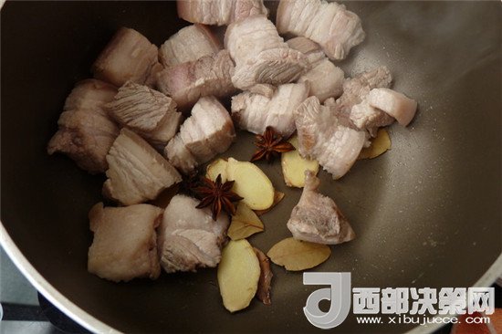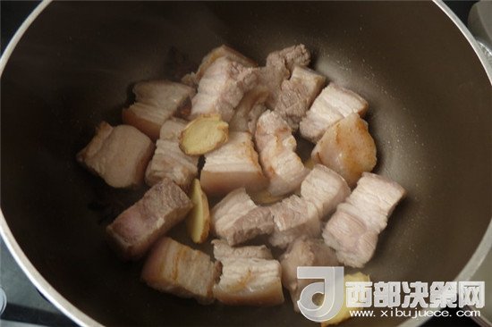 4.把肉炒至有點了出油后加入八角,姜片,香葉