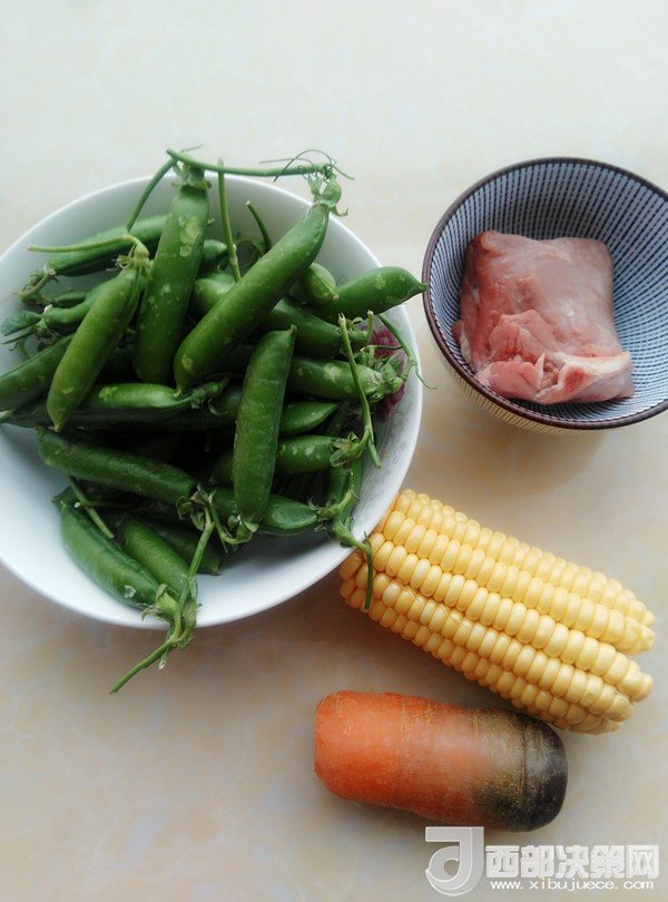 主料:胡蘿卜 1根 玉米 1根 豌豆 300克 里脊肉 100克