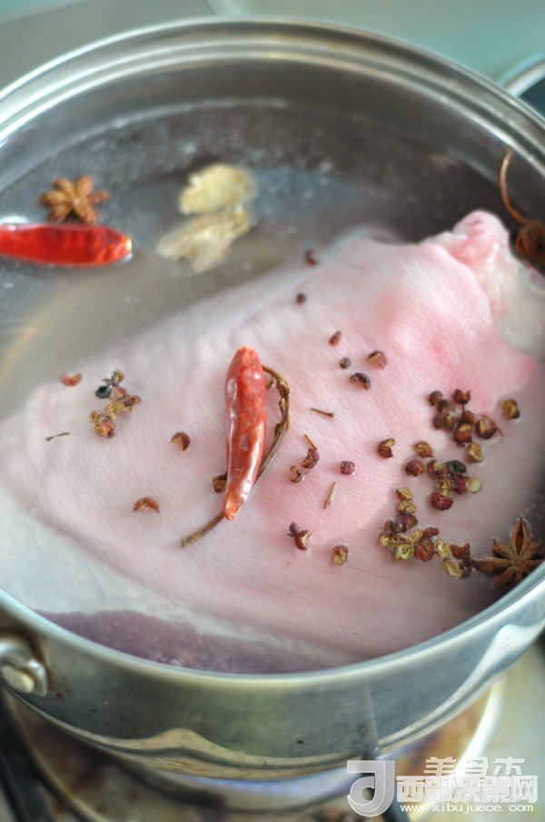 1.肘子冷水下鍋,水里放入干辣椒、花椒、大料、姜片,煮至水開