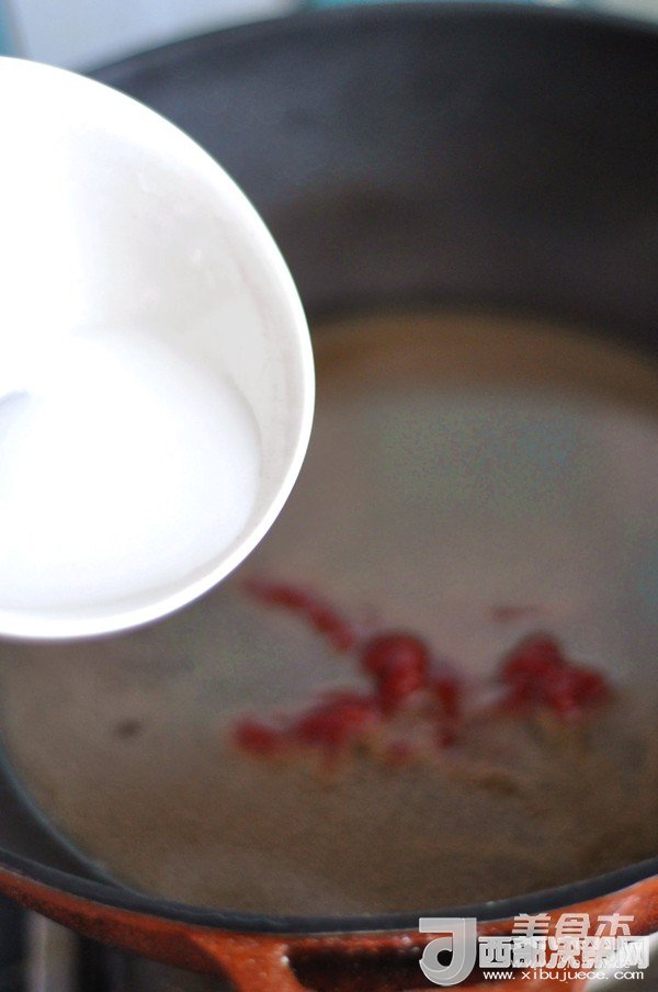 3.鍋里倒入油,放入花椒、大料、香葉、白芷、干辣椒,小火炸香