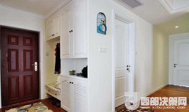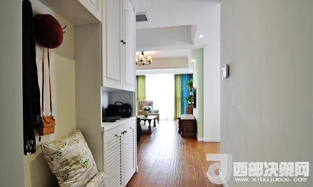 進(jìn)門玄關(guān),貼壁做了一排的櫥柜,模仿國外家居設(shè)計,做了一個連體的矮柜換鞋凳,上方安裝掛鉤吊衣服。