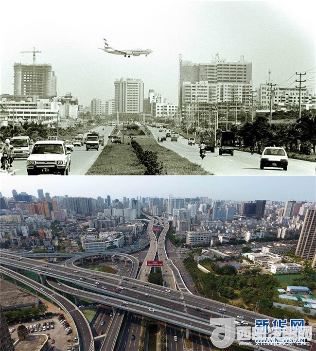 拼版照片為??谑泻8方裎魧Ρ龋ㄉ蠄D為1988年12月新華社記者姜恩宇攝,下圖為2018年4月14日新華社記者郭程攝)。
