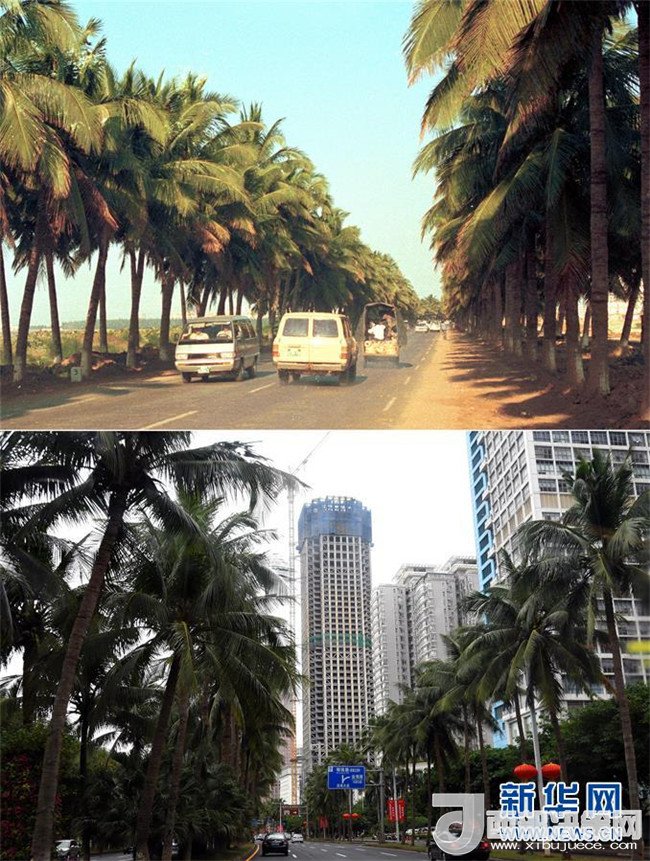 拼版照片為三亞市亞龍灣今昔對比(上圖為1998年新華社記者姜恩宇攝,下圖為2018年4月4日新華社記者郭程攝)。